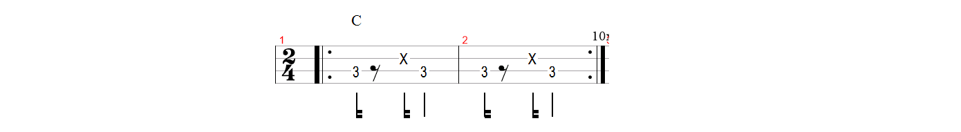 O ritmo básico é tocado da seguinte forma, no primeiro tempo tocamos a nota seca, stacatto, em seguida usamos a nota morta e deixamos soar no segundo tempo para valorizarmos o surdo do samba.