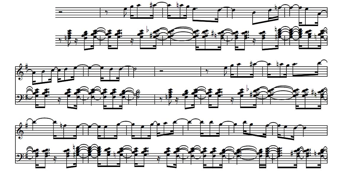 A melodia dessa canção foi criada antes, pensando em um samba. Ela foi criada na tonalidade de Sol maior. Por isso observe que a melodia da mão direita é bastante sincopada. Para enriquecer essa melodia usamos na parte “A” intervalos de sexta. Na parte “B” usamos um pouco de pentatônica com blue-notes, para lembrar uma bossa-nova.