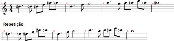 Vamos pegar como exemplo a melodia que criamos em modo dório, em 4/4: