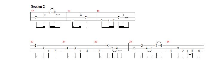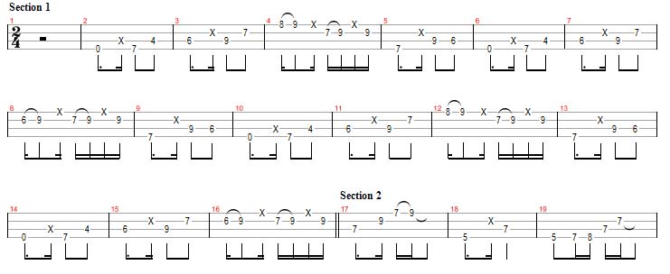 A levada do contrabaixo, para a parte “A”, foi criada pensando os intervalos dos acordes, e a escala do acorde correspondente, sem perder o ritmo do cururu. Usando bastante as notas mortas para dar groove