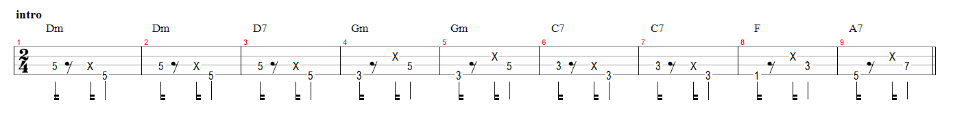 Dm | D7 | Gm | % | C7 | % | F | A7 | Dm | D7 | Gm | % | Em7(b5) | A7 | Dm | A7 |