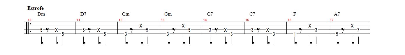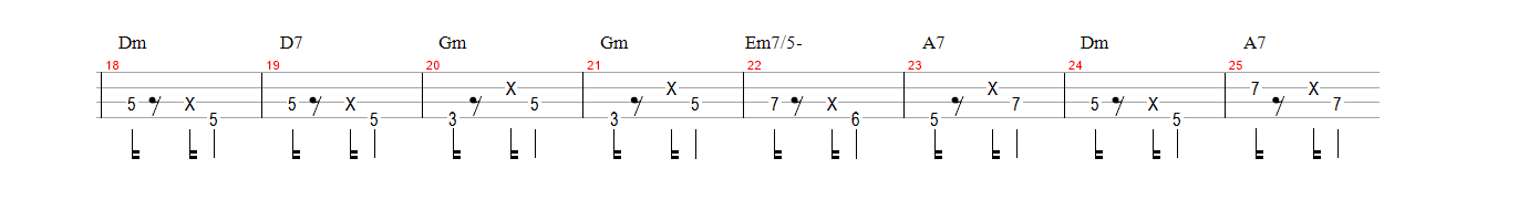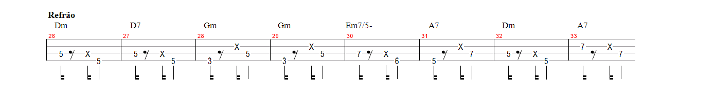 Aplicando o groove com as quintas justas para os acordes maiores, menores e de preparação (7) e as quintas menores para o acorde meio diminuto, podemos tocar assim: