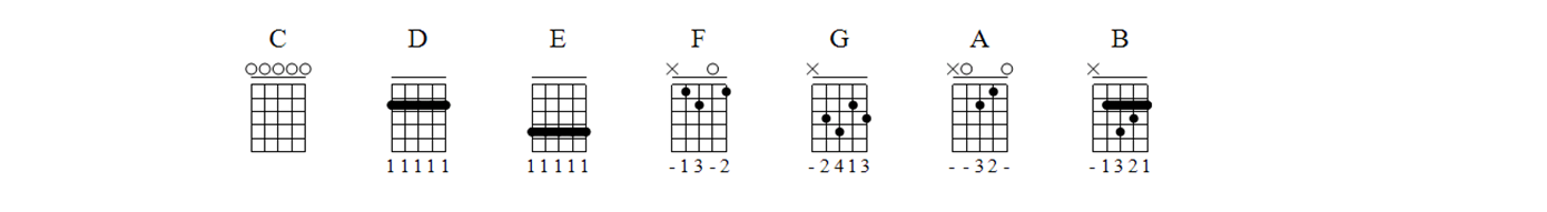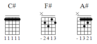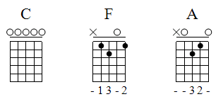 Três formatos de acordes maiores, basicamente, irão gerar todos os outros acordes maiores. Serão os acordes de C, F e A.