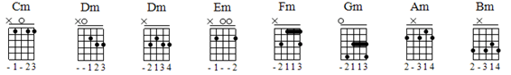 Três formatos de acordes menores, basicamente, irão gerar todos os outros acordes menores. Serão os acordes de Cm, Em e Am.