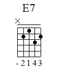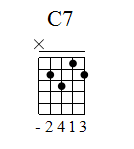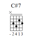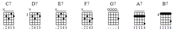 Três formatos de acordes dominantes, basicamente, irão gerar todos os outros acordes dominantes. Serão os acordes de C7, E7 e G7.