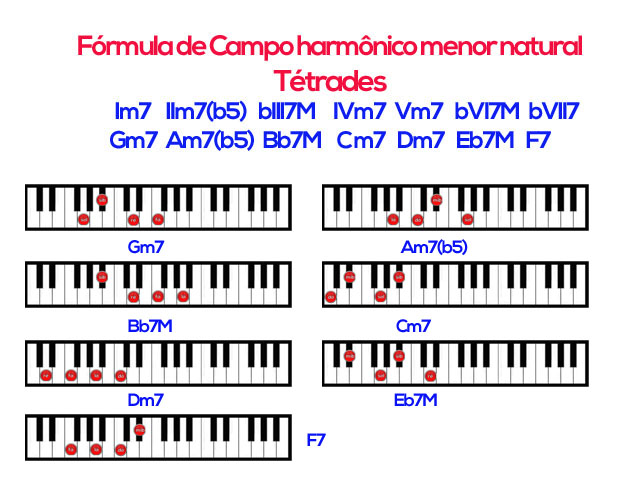 Para formarmos um campo harmônico menor, precisamos primeiramente montar a escala menor, tendo as notas da escala aplicamos a seguinte fórmula:
