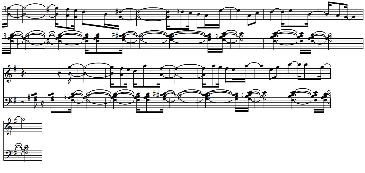 A melodia dessa canção foi criada antes, pensando em um samba. Ela foi criada na tonalidade de Sol maior. Por isso observe que a melodia da mão direita é bastante sincopada. Para enriquecer essa melodia usamos na parte “A” intervalos de sexta. Na parte “B” usamos um pouco de pentatônica com blue-notes, para lembrar uma bossa-nova.