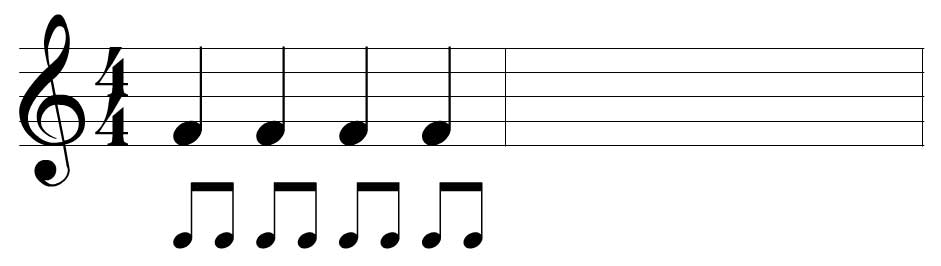 - O compasso 4/4 é classificado como quaternário simples por ele ter quatro tempos que podem ser divididos, cada um, em duas notas.