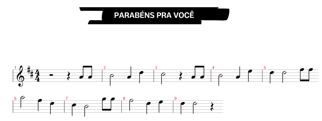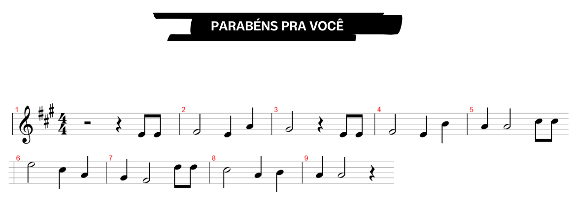 Observando a partitura abaixo, vemos a música "Parabéns para Você" no tom de ré maior. Isso implica que todo fá será sustenido e todo dó será sustenido, não importando onde apareçam essas notas na partitura.