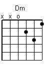 O acorde de Ré menor (Dm) é um pouco mais complicado para iniciantes. Dedo indicador na primeira corda, primeira casa; dedo médio na terceira corda, segunda casa; e dedo anelar na segunda corda, terceira casa. Toco da quarta corda para baixo.