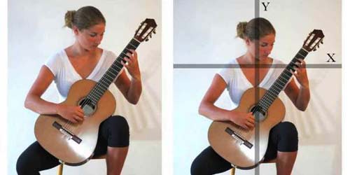 Forma clássica - Violão na perna esquerda, pé apoiado num suporte, braço com uma inclinação de 45 º